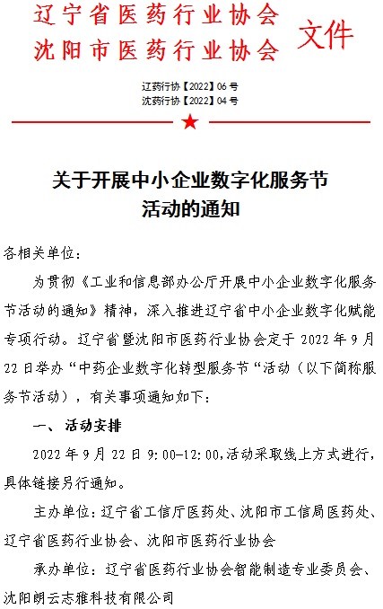 為貫徹《工業(yè)和信息部辦公廳開展中小企業(yè)數(shù)字化服務(wù)節(jié)活動的通知》精神,深入推進(jìn)遼寧省中小企業(yè)數(shù)字化賦能專項行動。遼寧省暨沈陽市醫(yī)藥行業(yè)協(xié)會定于2022年9月22日舉辦“中藥企業(yè)數(shù)字化轉(zhuǎn)型服務(wù)節(jié)“活動(以下簡稱服務(wù)節(jié)活動),有關(guān)事項通知如下:
